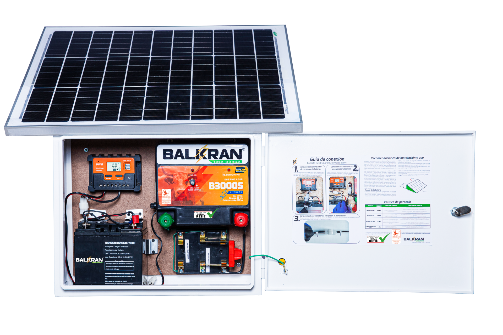 Energizador B3000S Gabinete Metálico Batería 12V 26A Regulador 10A** Panel Solar 60W** Cuchilla doble tiro Conexiones internas