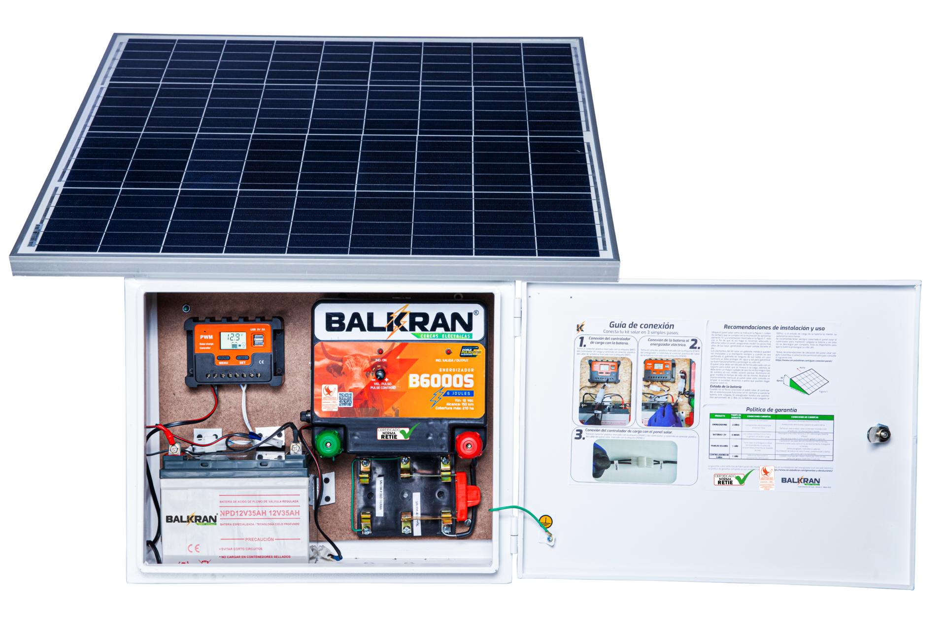 Energizador B6000S Gabinete Metálico Batería 12V 35A Regulador 10A** Panel Solar 100W** Cuchilla doble tiro Conexiones internas