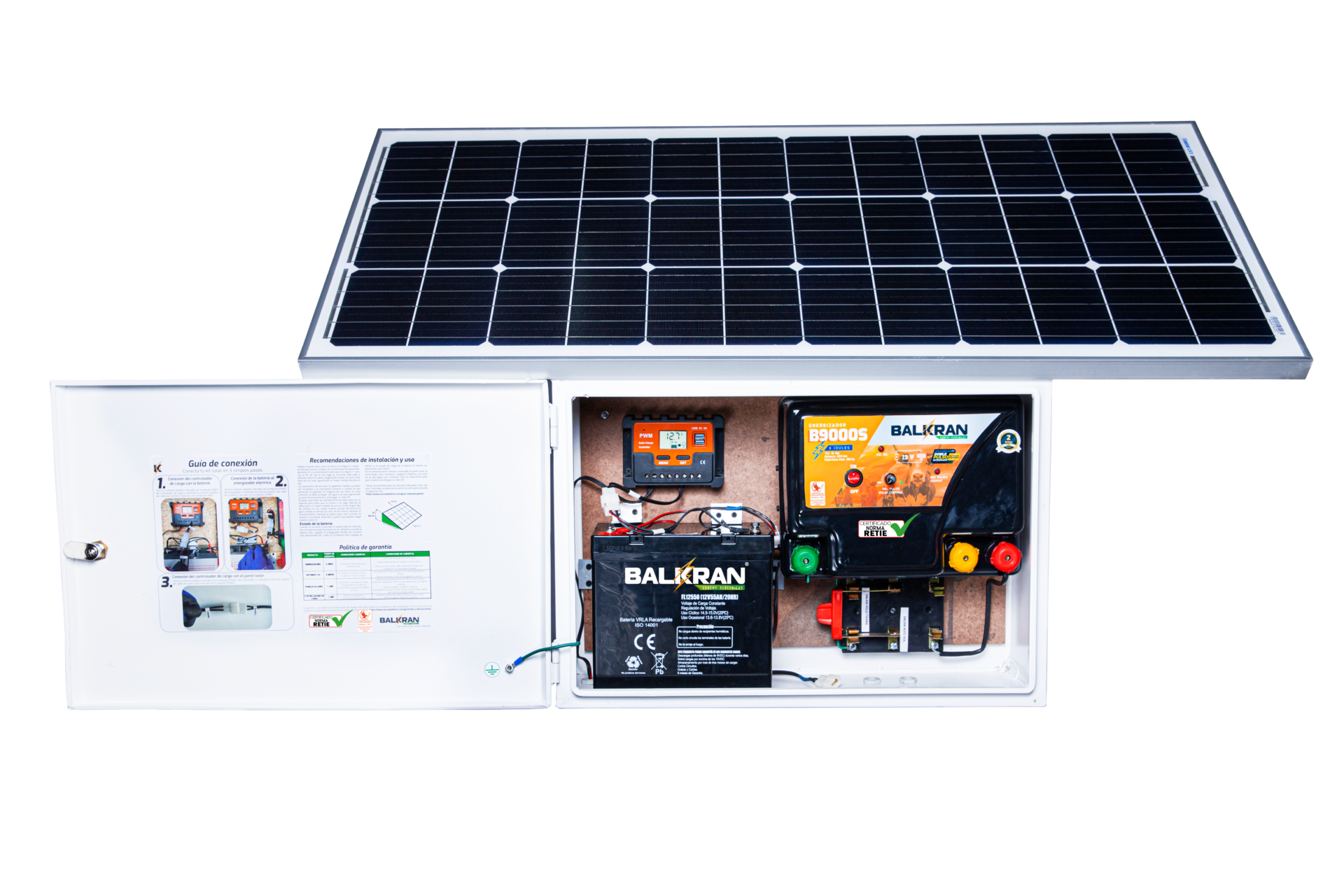 Energizador B9000S Gabinete Metálico Batería 12V 55A Regulador 20A** Panel Solar 100W** Cuchilla doble tiro Conexiones internas