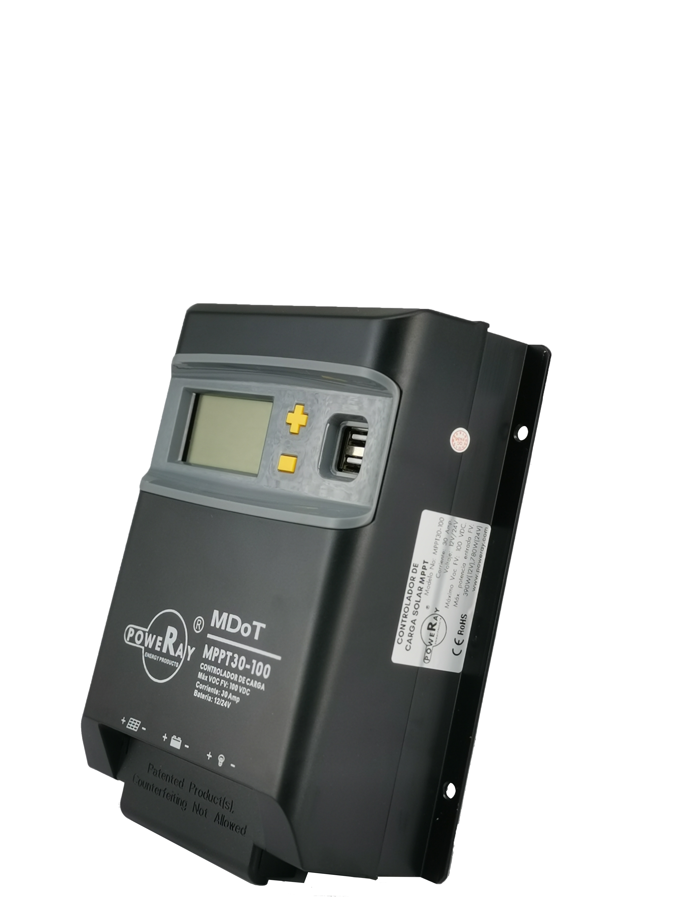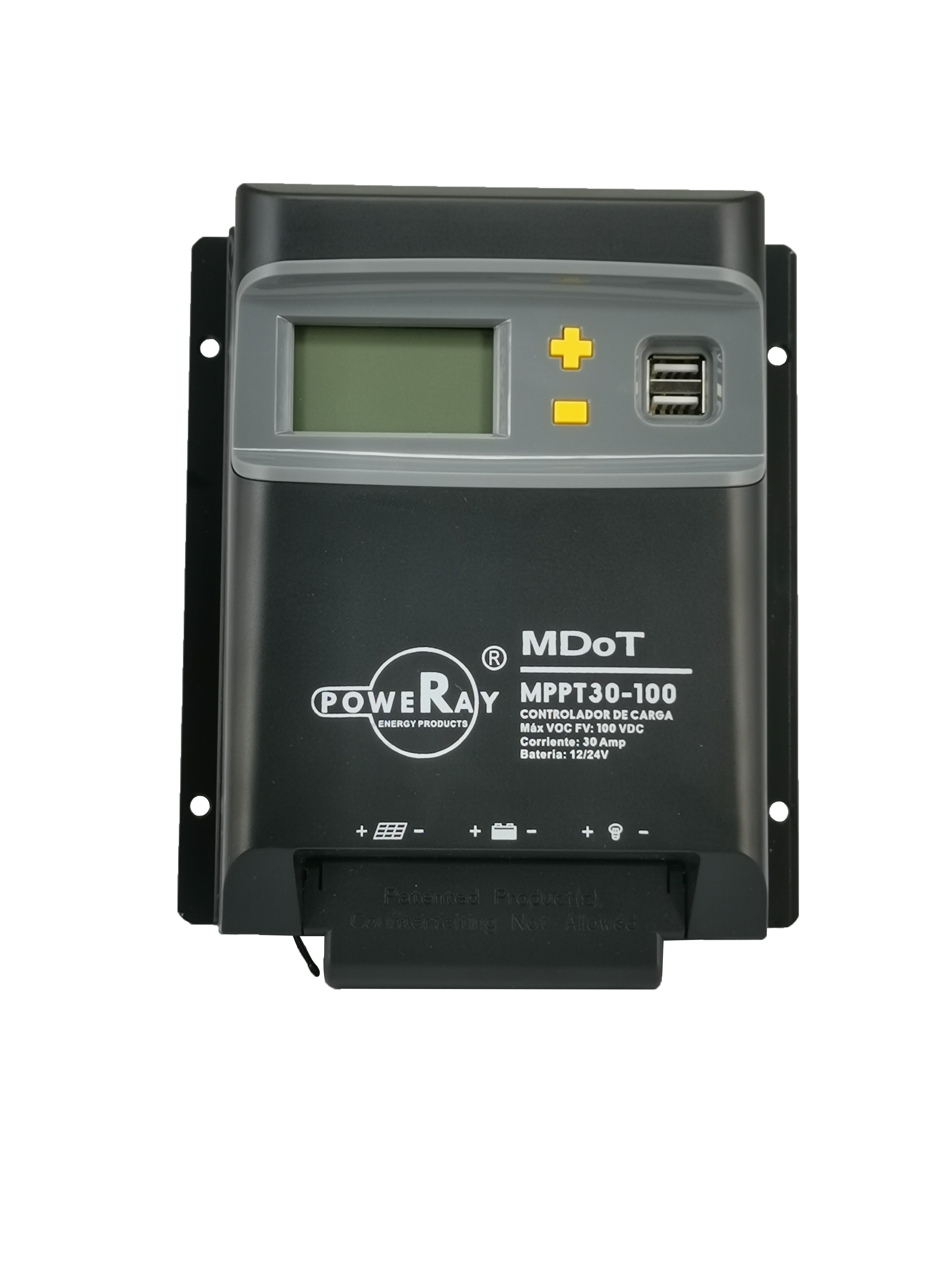 CONTROLADOR DE CARGA MPPT SERIE MDoT 30 AMP 100 Voc 12/24 DCV CON PUERTO USB., PANTALLA LED, MARCA POWERAY.